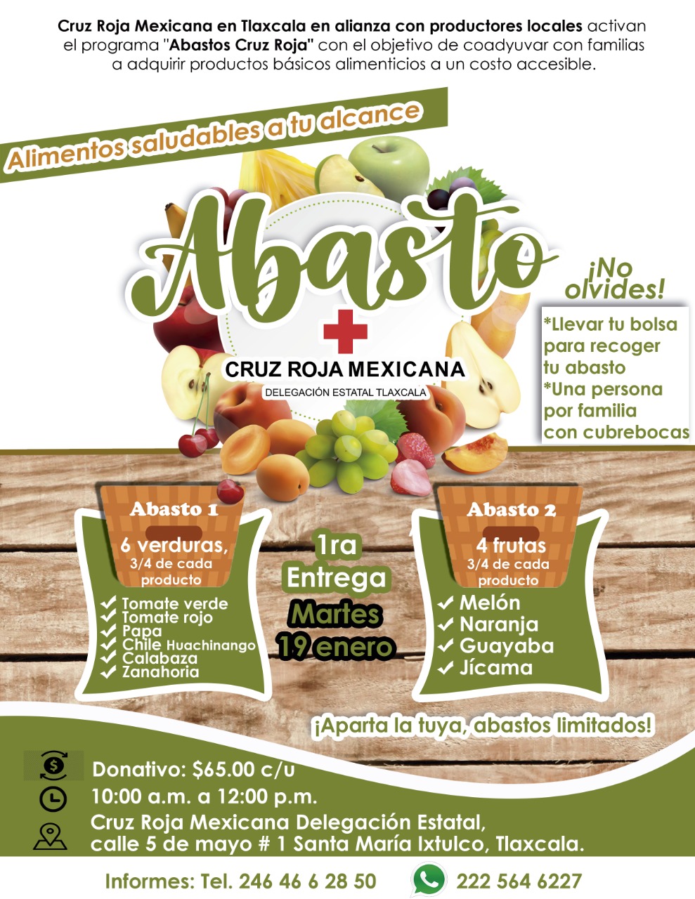 Se manejan 1 abasto de frutas y 1 de verduras, el cual cada semana se comprende de diferentes productos por un donativo de $65.00 c/u que pueden realizar a través de transferencia electrónica a Cruz Roja Mexicana Delegación Tlaxcala IAP, Cuenta: 0115809142 – Clabe: 012830001158091429 – enviando Boucher de pago a bmorales.tlax@cruzrojamexicana.org.mx concepto “Abasto” y nombre completo o pago en efectivo.