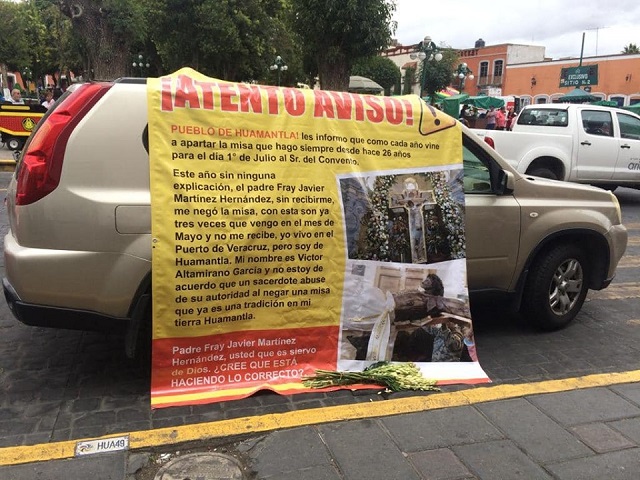 Huamantla, Tlax.- Ante la negativa del padre Superior del Convento Franciscano, para celebrar la misa el día primero de julio con motivo de la festividad de la Preciosa Sangre de Cristo, que se realiza cada año en este templo, Víctor Altamirano García, desde temprana hora de este domingo se manifestó con una lona colocada sobre una camioneta y con trípticos al exterior del templo religioso para dar a conocer la situación.