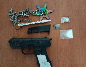 -Se trata de una réplica similar a la de un arma de fuego, dos objetos aptos para agredir y tres bolsas de plástico que contenían una sustancia similar al “cristal”