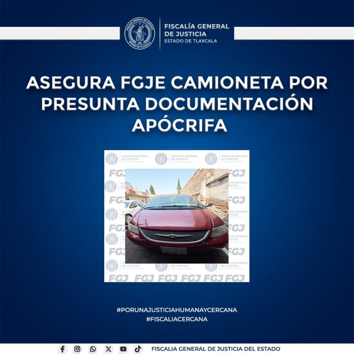 Agentes de la Policía de Investigación de la Fiscalía General de Justicia del Estado (FGJE) pusieron a disposición del Ministerio Público una camioneta marca Chrysler, línea Town & Country, modelo 2004, que presentaba documentación presumiblemente apócrifa.