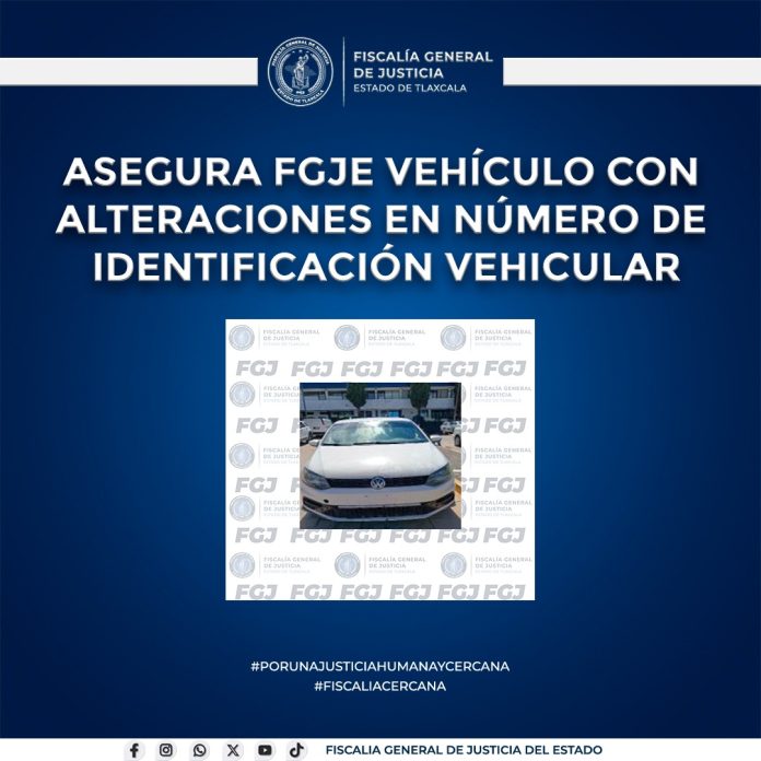 La Policía de Investigación de la Fiscalía General de Justicia del Estado (FGJE) aseguró un vehículo marca Volkswagen, tipo Vento, modelo 2020, color blanco, que presentaba aparentes alteraciones en su número de identificación vehicular.