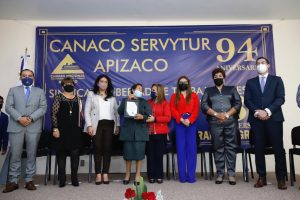 Apizaco,Tlax. -La gobernadora Lorena Cuéllar Cisneros asistió como invitada especial al evento conmemorativo del 94 aniversario de la Cámara Nacional de Comercio, Servicios y Turismo (Canaco-Servytur) del municipio de Apizaco, donde reiteró su compromiso de trabajar para convertir a Tlaxcala en un polo de desarrollo.
