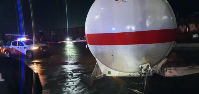 Huamantla, Tlax.- Elementos de la Coordinación de Protección Civil de Huamantla, atendieron esta noche -como primeros respondientes- un percance entre un tracto camión que transportaba dos tanques de combustible vacíos con el tren, a la altura de conocido establecimiento comercial en el cruce de camino a Benito Juárez.