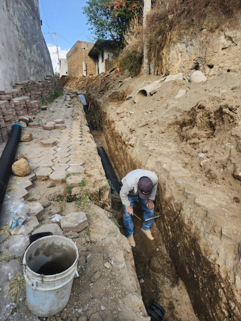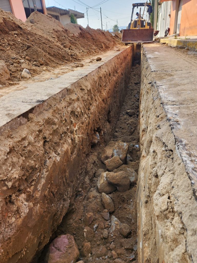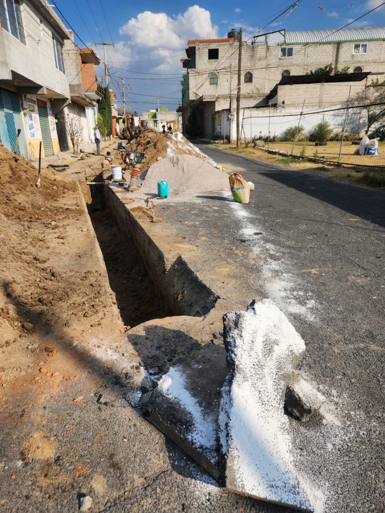 En la calle Benito Juárez, esquina con Calle Principal de la Sección Tercera Xaltipan, se reportan avances en la instalación de aproximadamente 160 metros de tubería corrugada de 12 pulgadas para drenaje sanitario, además de la construcción de pozos de visita y la posterior rehabilitación del pavimento asfáltico.