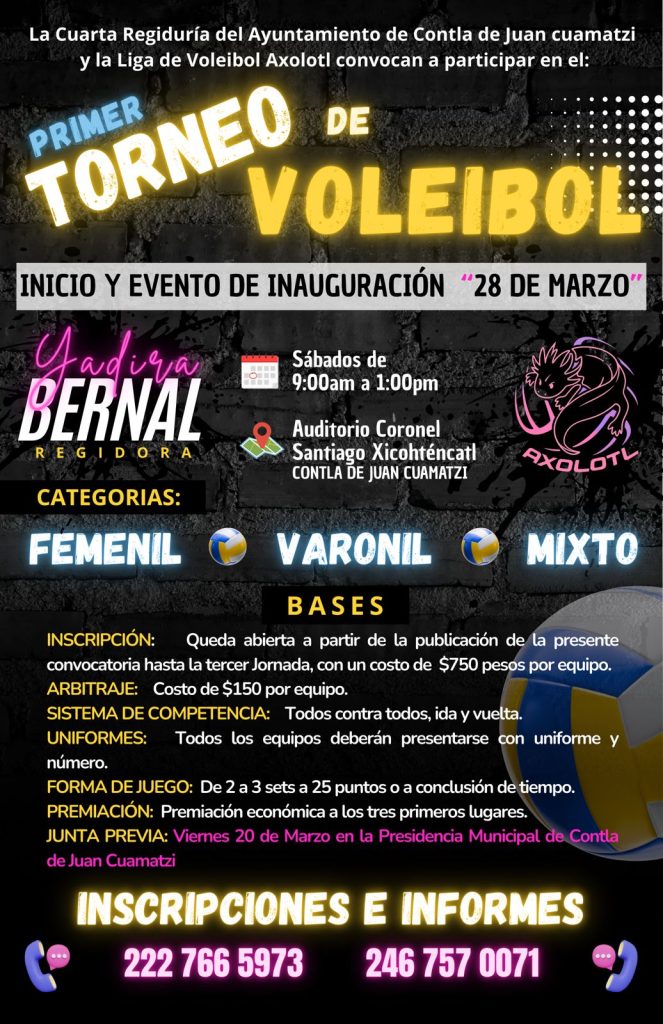 Contla de Juan Cuamatzi, Tlax. – El municipio de Contla de Juan Cuamatzi se prepara para el arranque de un torneo de voleibol que dará inicio este sábado 28 de marzo en el auditorio municipal, con la participación de equipos en distintas categorías y una bolsa económica atractiva para los ganadores.