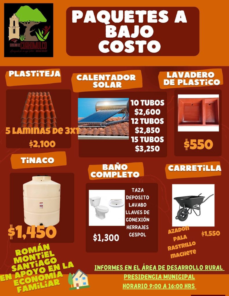 Cuaxomulco, Tlax. – Con el objetivo de contribuir al bienestar y economía de las familias y facilitar el mejoramiento de los hogares, el Ayuntamiento de Cuaxomulco, encabezado por el presidente municipal Román Montiel Santiago, puso a disposición de la ciudadanía diversos paquetes de materiales y productos a bajo costo.