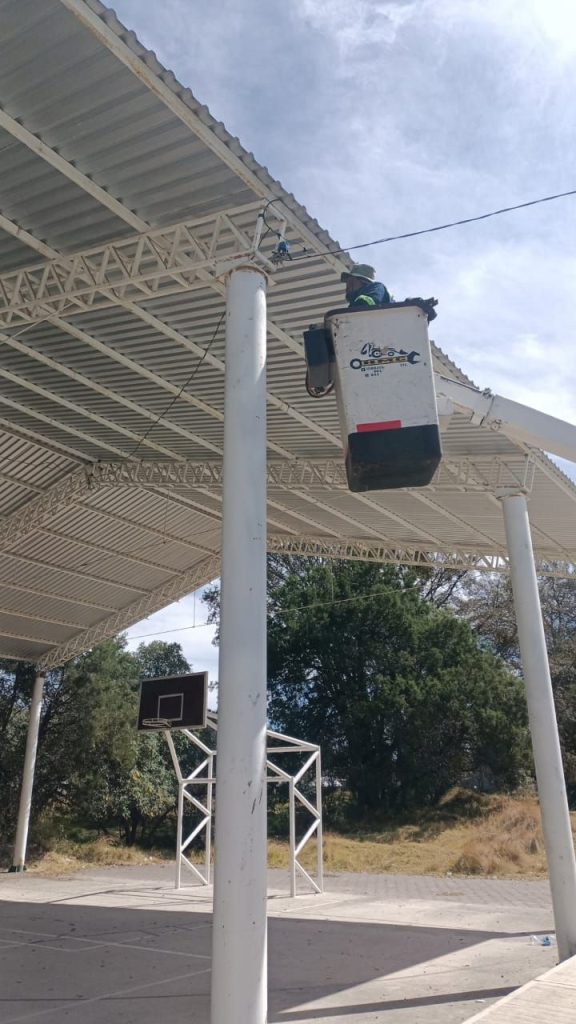 Asimismo, como parte del compromiso con el deporte y los espacios de convivencia, se realizó el cambio de la fotocelda en la lámpara de las canchas de básquetbol de Zacamolpa, permitiendo un mejor funcionamiento del alumbrado y condiciones más seguras para la práctica deportiva.