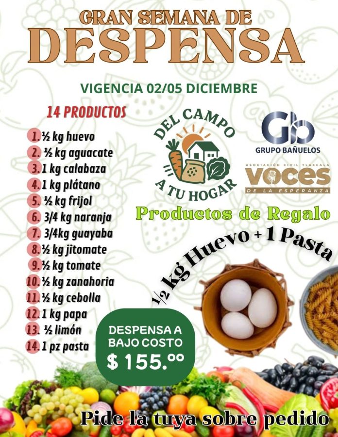 El programa busca que más familias puedan complementar su alimentación sin afectar su presupuesto, especialmente en un contexto donde los costos de la canasta básica han representado un desafío para muchos hogares. Para participar, únicamente es necesario apartar el pedido mediante un mensaje al número 241 372 42 59 y cubrir el costo al momento de recibirlo.