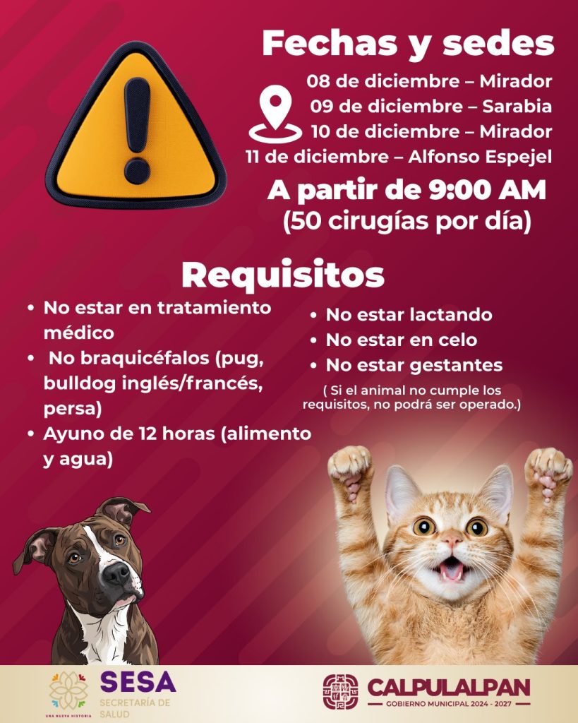 Para garantizar la seguridad de las mascotas durante la cirugía, las autoridades informaron los requisitos indispensables: los animales no deben estar lactando, en celo, gestantes ni bajo tratamiento médico; además, no se atenderán razas braquicéfalas como pug, bulldog inglés o francés y gatos persas. También se solicita un ayuno de 12 horas y una edad mínima de tres meses.