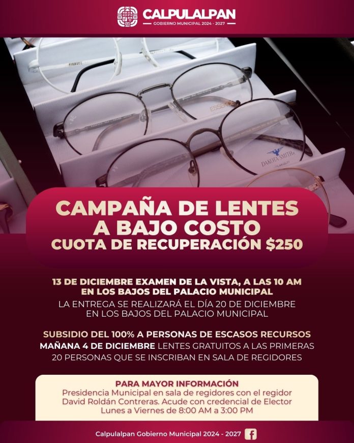 Calpulalpan, Tlax. – El Gobierno Municipal de Calpulalpan anunció el inicio de una campaña de lentes a bajo costo con el propósito de mejorar la salud visual de la población, especialmente de quienes enfrentan dificultades económicas.