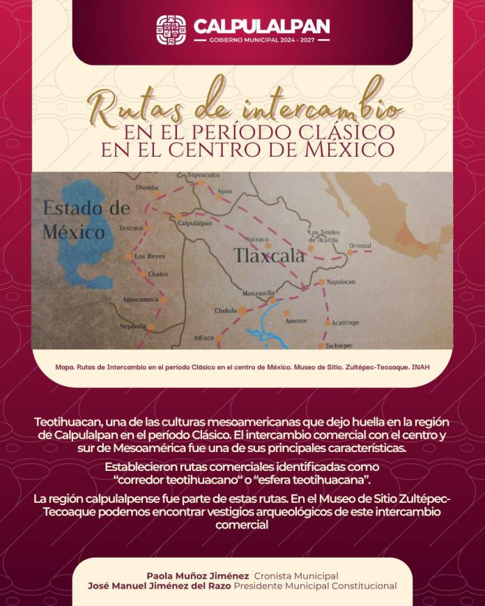 Calpulalpan, Tlax. – El Gobierno Municipal de Calpulalpan, encabezado por el Alcalde José Manuel Jiménez del Razo, en colaboración con la cronista municipal Paola Muñoz Jiménez, compartió un importante fragmento histórico que destaca el papel de la región calpulalpense dentro de las antiguas rutas de intercambio del centro de México.