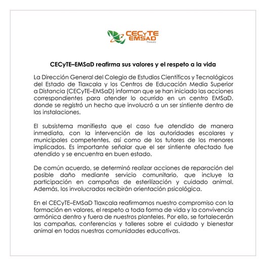 La Dirección General del Colegio de Estudios Científicos y Tecnológicos del Estado de Tlaxcala y los Centros de Educación Media Superior a Distancia (CECyTE–EMSaD) informan que se han iniciado las acciones correspondientes para atender lo ocurrido en un centro EMSaD, donde se registró un hecho que involucró a un animal dentro de las instalaciones.