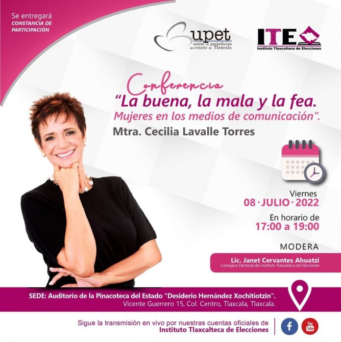 Tlaxcala,Tlax. -La Unión de Periodistas del Estado de Tlaxcala (UPET) y el Instituto Tlaxcalteca de Elecciones (ITE) convocan al gremio periodístico, activistas y público en general, a la conferencia intitulada: “La buena, la mala y la fea. Mujeres en los medios de comunicación”, que será dictada por la especialista en temas de género, Cecilia Lavalle Torres.