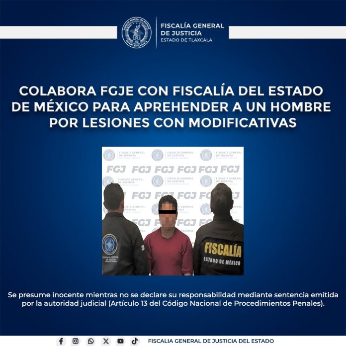 La Fiscalía General de Justicia del Estado (FGJE) colaboró con la Fiscalía General de Justicia del Estado de México (FGJEM) para cumplimentar una orden de aprehensión en contra de Arturo N., por el delito de lesiones con modificativas, ocurrido en dicha entidad.