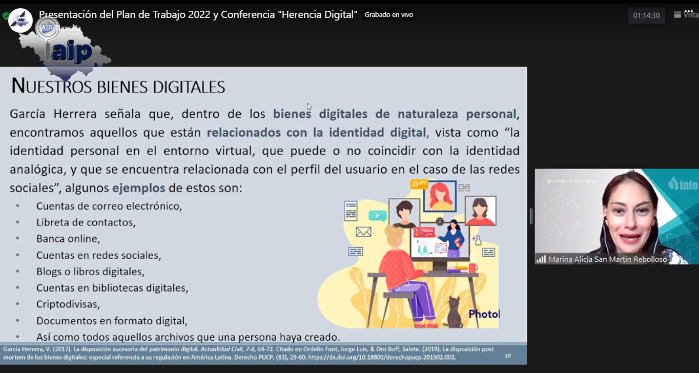 En lo que corresponde a los denominados bienes digitales, Marina San Martín recordó que se trata de aquellos que se refieren a la identidad digital, vista ésta como la información personal en el entorno virtual que puede o no coincidir con la identidad analógica o física.