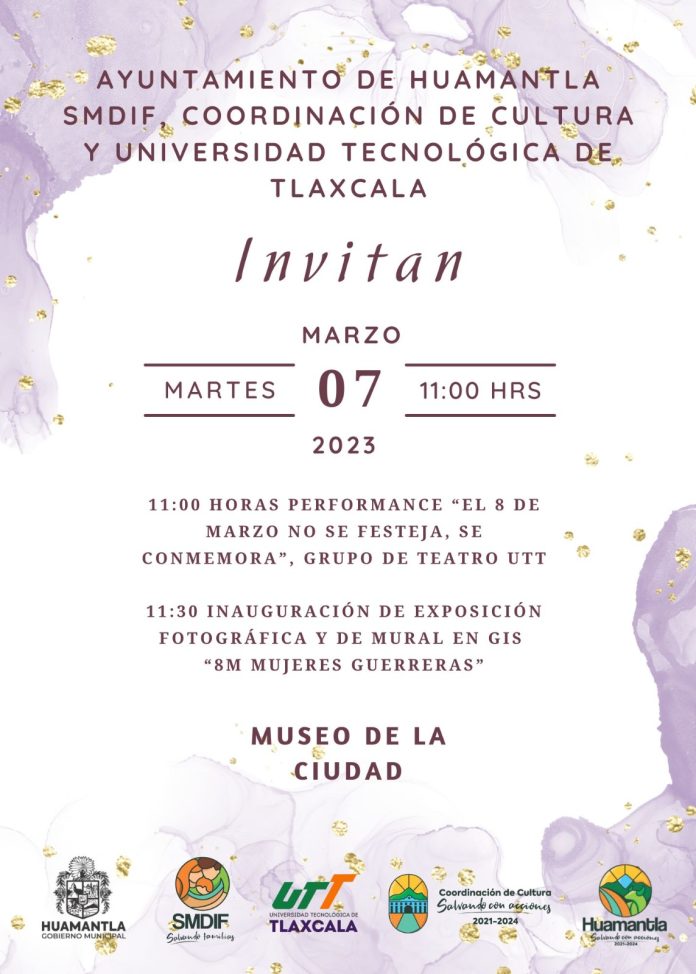 Será a las 11:00 horas que se presentará el performance “El 8 de marzo no se festeja, se conmemora”, del grupo de Teatro de la Universidad Tecnológica de Tlaxcala (UTT), la cual busca dar un mensaje de conciencia y hacer un alto contra la violencia hacia la mujer.