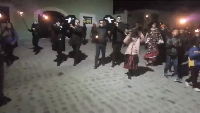 Al frente del contingente que se sumó a esta iniciativa del gobierno municipal, hombres vestidos elegantemente y pintados con motivos propios del día de Muertos, simularon cargar dos ataúdes, simulando el cortejo fúnebre, donde los “muertos, acompañan a sus muertos”.