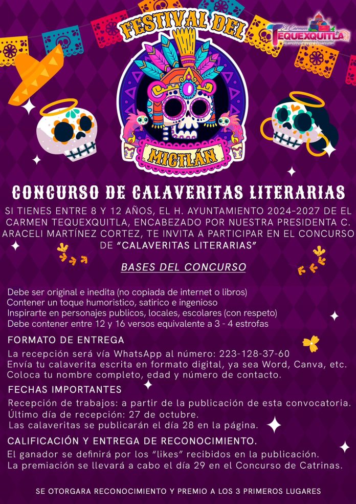 Tequexquitla, Tlax. – El Ayuntamiento de El Carmen Tequexquitla, encabezado por la presidenta municipal Araceli Martínez Cortez, lanzó la convocatoria para el Concurso de Calaveritas Literarias, una actividad dirigida a niñas y niños de entre 8 y 12 años, como parte de las celebraciones del Festival del Mictlán 2025.