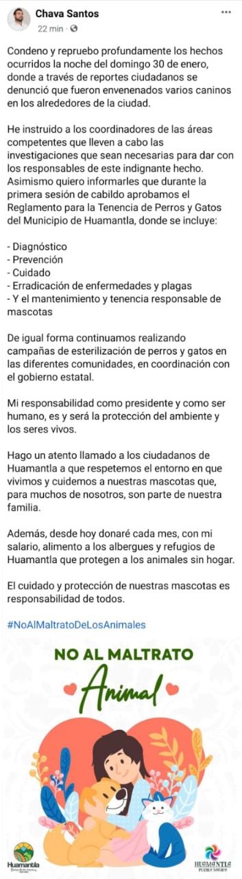 A través de un mensaje en sus redes sociales, el presidente municipal de Huamantla, Salvador Santos Cedillo, reprobó los hechos ocurridos la noche del domingo 30 de enero, donde fueron envenenados varios caninos, en los alrededores de la ciudad.