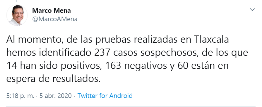 Después, publicó: “Al momento, de las pruebas realizadas en Tlaxcala hemos identificado 237 casos sospechosos, de los que 14 han sido positivos, 163 negativos y 60 están en espera de resultados”.