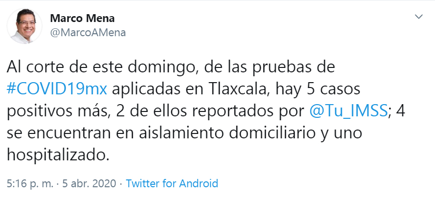 En su perfil de Twitter, el Gobernador Marco Mena escribió: “Al corte de este domingo, de las pruebas de #COVID19mx aplicadas en Tlaxcala, hay 5 casos positivos más, 2 de ellos reportados por @Tu_IMSS; 4 se encuentran en aislamiento domiciliario y uno hospitalizado”.