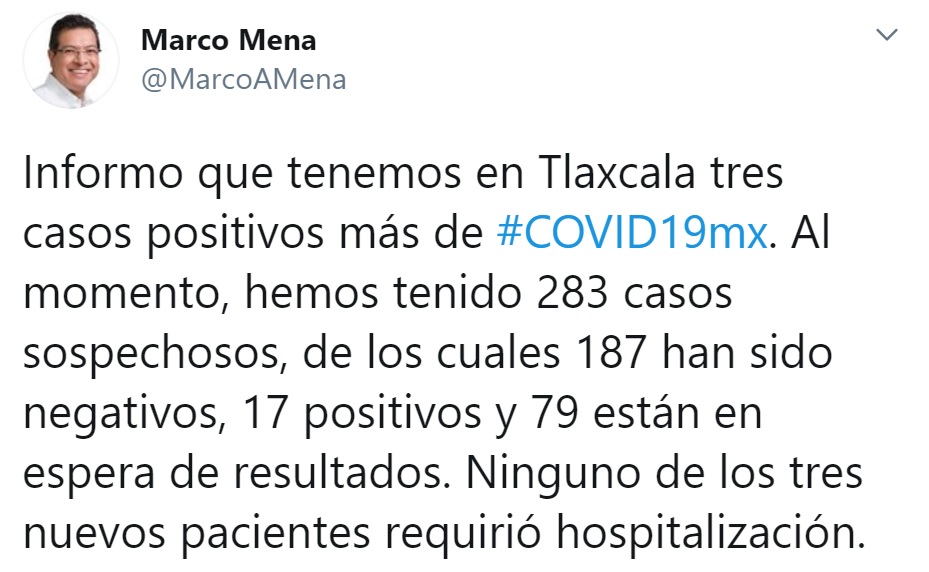En su perfil de Twitter, el Gobernador Marco Mena escribió: ” Informo que tenemos en Tlaxcala tres casos positivos más de #COVID19mx. Al momento, hemos tenido 283 casos sospechosos, de los cuales 187 han sido negativos, 17 positivos y 79 están en espera de resultados. Ninguno de los tres nuevos pacientes requirió hospitalización”.