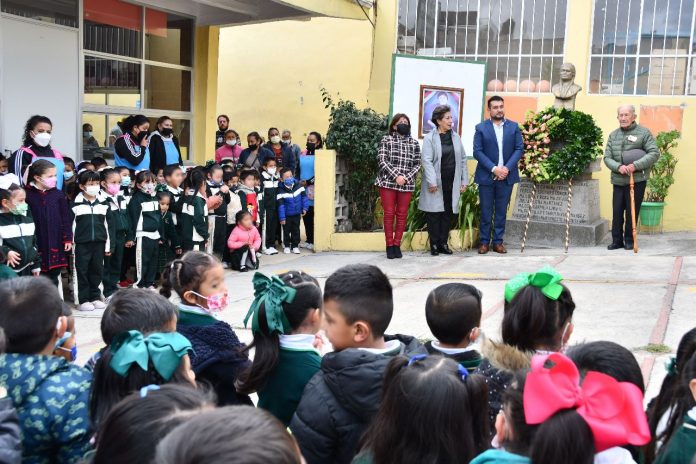 Más tarde, en el Jardín de Niños Josefa Castelar, el alcalde Salvador Santos Cedillo, rindió honores a la bandera, y frente a padres de familia, alumnas, alumnos y docentes, informó que con los ahorros que ha generado la administración municipal, construirán la techumbre en beneficio de más de 240 estudiantes que realizan sus actividades físicas y cívicas en el patio principal.