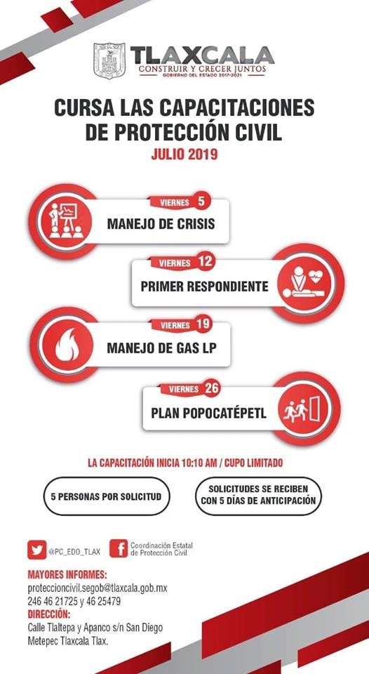 Como parte de la estrategia para consolidar la cultura de la prevención entre la población tlaxcalteca y difundir los protocolos adecuados de actuación ante cualquier desastre natural o provocado por el hombre, la Coordinación Estatal de Protección Civil (CEPC) realizará diversos cursos de capacitación durante julio.