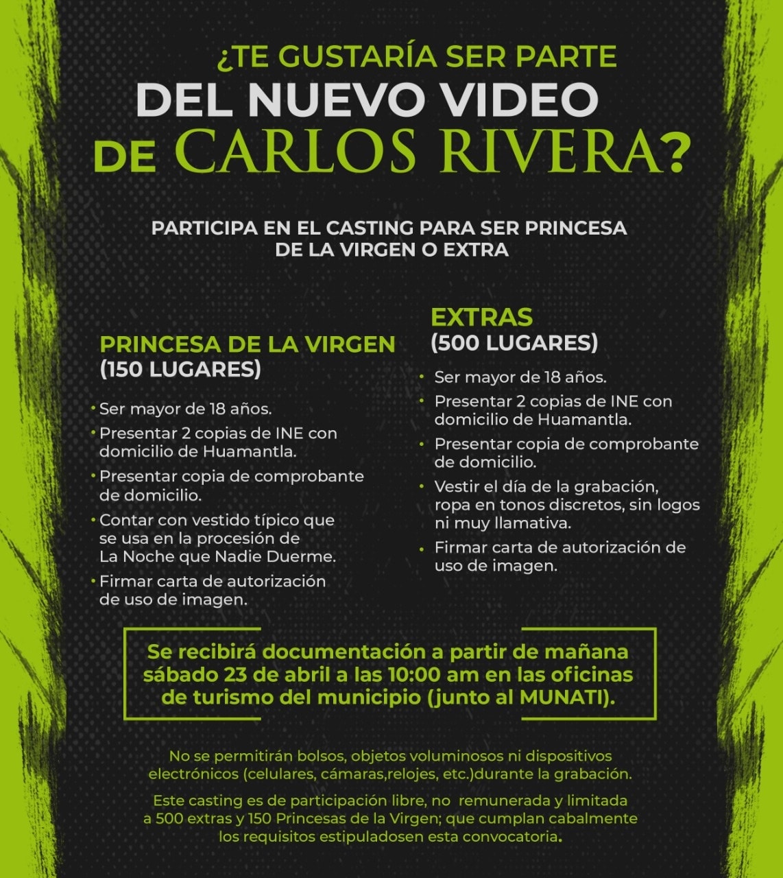Como parte de los requerimientos que solicita la producción del nuevo video musical del huamantleco Carlos Rivera y el colombiano Carlos Vives, que se grabará en el centro histórico de Huamantla los días 25 y 26 de abril, se mantiene abierta la convocatoria para participar en el casting como Princesas de la Virgen o extras.