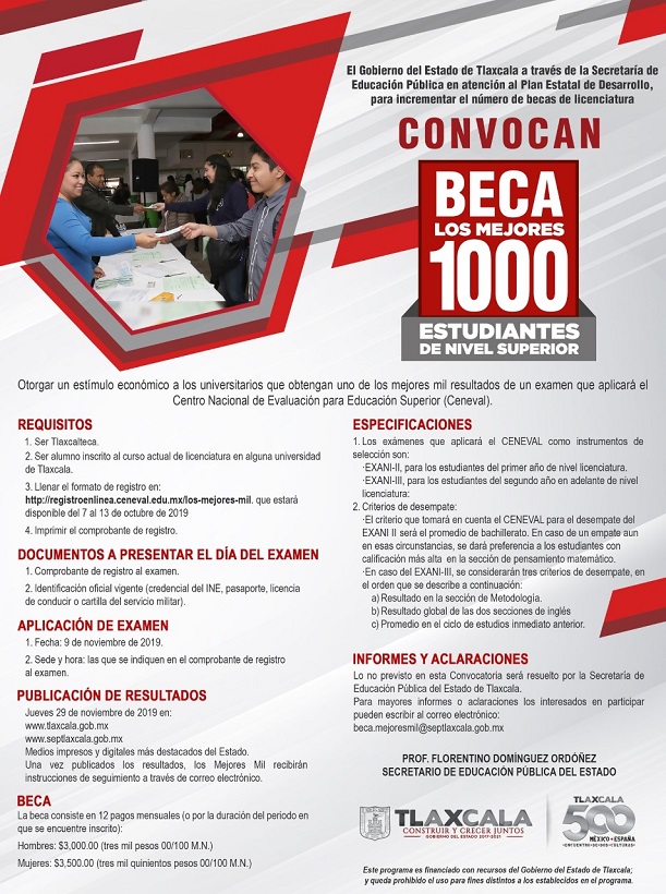 Tlaxcala, Tlax.- El Gobierno de Estado, a través de la Secretaría de Educación Pública (SEPE), convoca a jóvenes universitarios a participar para obtener la beca los “Mejores Mil”, a través del examen que aplicará el Centro Nacional de Evaluación para Educación Superior (Ceneval).