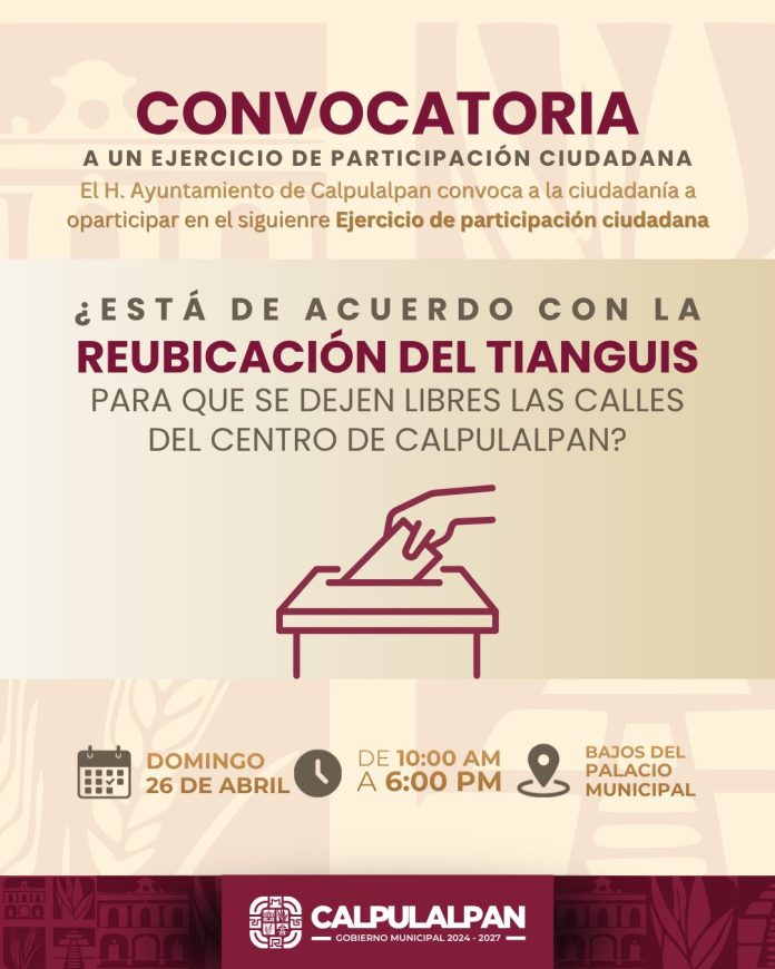 Calpulalpan, Tlax. – El Gobierno Municipal de Calpulalpan anunció la realización de una jornada de participación ciudadana para recabar la opinión de la población respecto a la posible reubicación del tianguis, con el propósito de mejorar la movilidad y mantener despejadas las vialidades del centro del municipio.