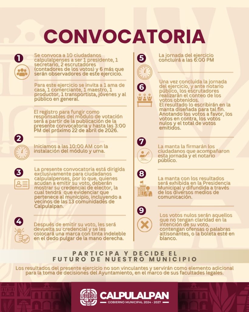 La jornada se llevará a cabo el domingo 26 de abril, en un horario de 10:00 de la mañana a 6:00 de la tarde, en los bajos del Palacio Municipal. Para participar, las y los ciudadanos deberán presentar su credencial de elector.