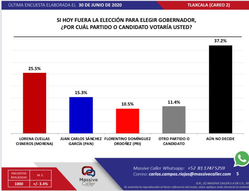 El ejercicio de medición fue realizado por la empresa Massive Caller, y la interrogante que se aplicó a mil personas vía telefónica fue, “Si hoy fueran las elecciones para elegir gobernador, ¿por cuál partido o candidato votaría usted?. Los resultados fueron publicados el pasado 30 de junio.