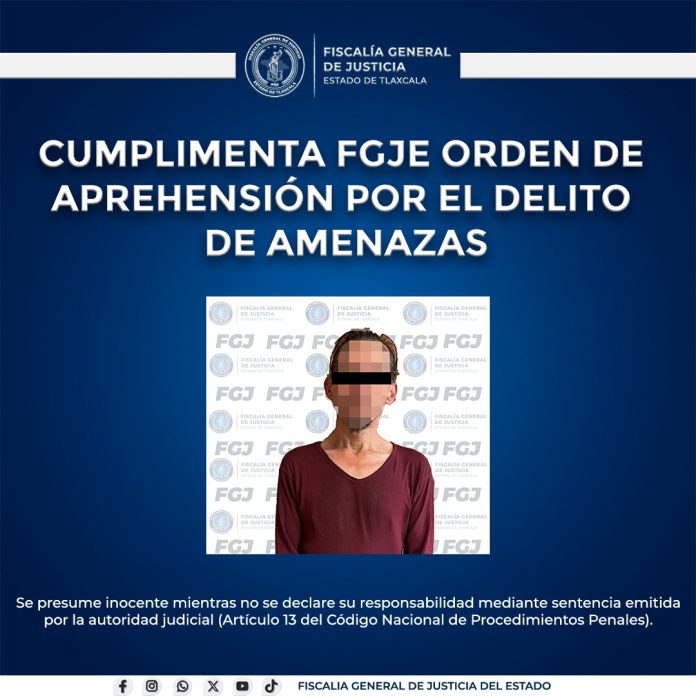 La Fiscalía General de Justicia del Estado (FGJE), a través de la Policía de Investigación, cumplimentó una orden de aprehensión en contra de Alejandro N., por su probable responsabilidad en el delito de amenazas.