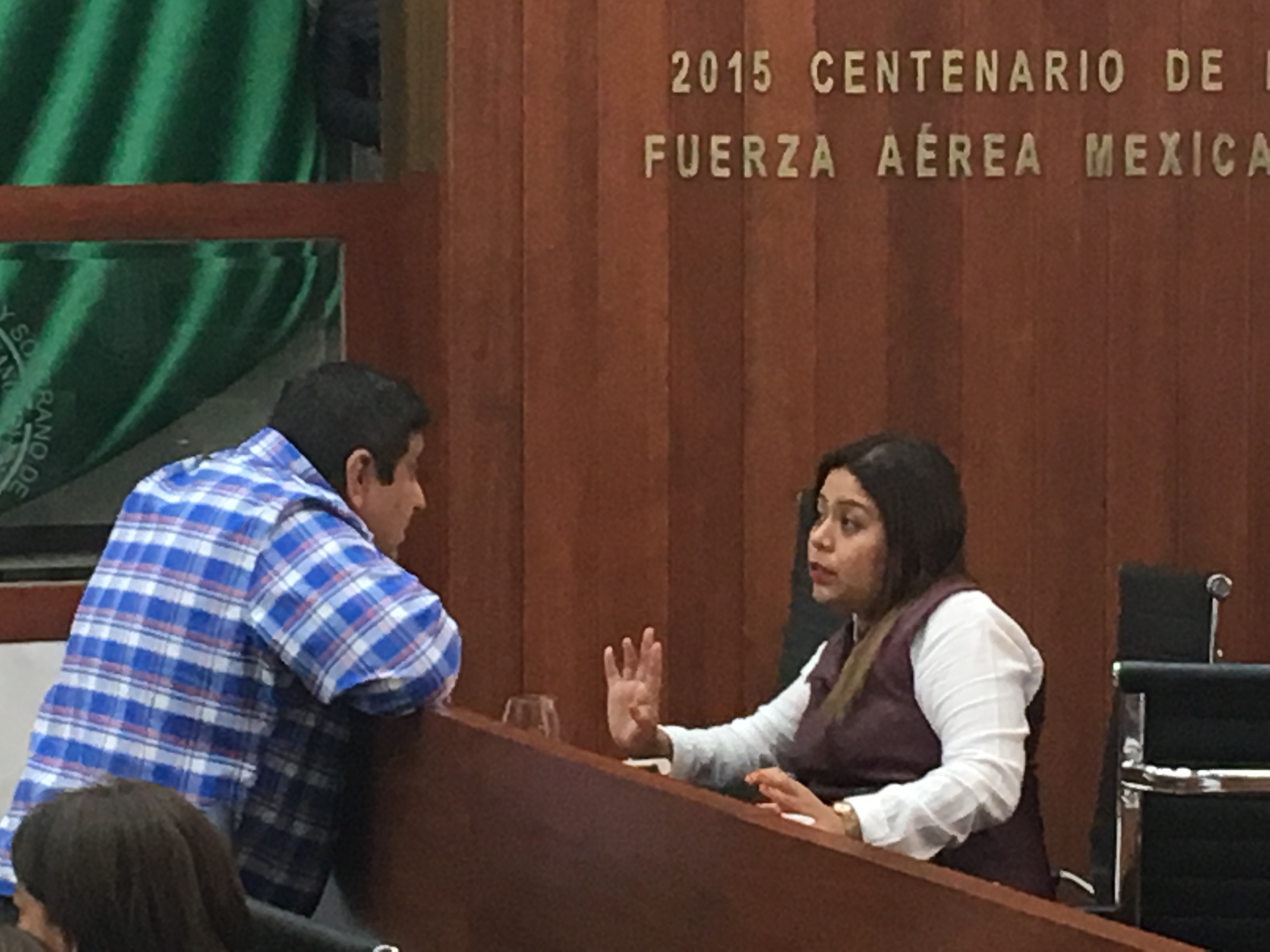 Los curules vacíos hacían más notoria la presencia de los legisladores, Víctor Castro, que solo veía al techo del Salón de Sesiones; la diputada Michelle Brito que le explicaba algún tema a la diputada Ana Bertha Mastranzo Corona.