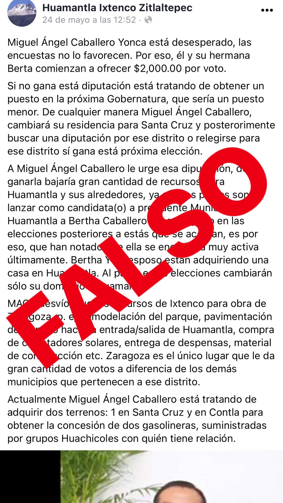 Huamantla, Tlax. – El equipo jurídico de campaña de Miguel Ángel Caballero Yonca, candidato a diputado local por el distrito X de la coalición “Juntos Haremos Historia en Tlaxcala” desmintió la publicación que circula en redes sociales sobre el supuesto compro del voto de la ciudadanía.