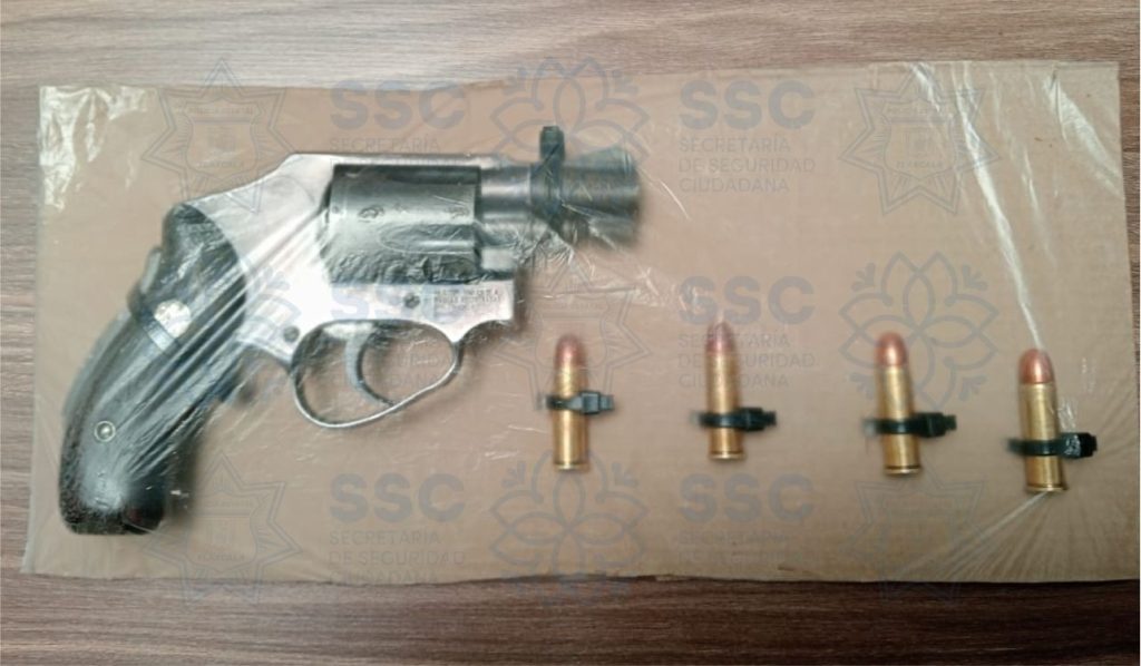 Durante la revisión, los elementos localizaron entre sus pertenencias un arma de fuego corta, calibre .38, así como cuatro cartuchos útiles. Al solicitarle la documentación correspondiente para acreditar la legal portación del arma, el sujeto no pudo acreditar la posesión legal de la misma.