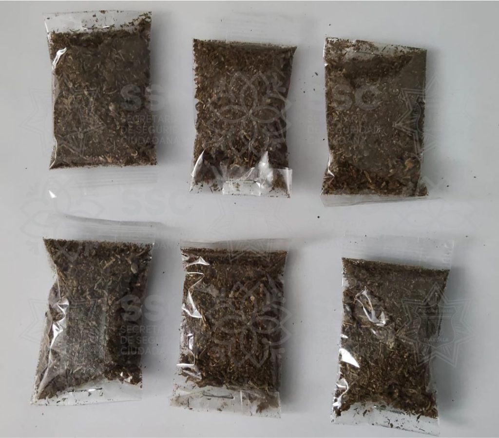 Tras realizarle una revisión conforme a los protocolos establecidos, los elementos de seguridad localizaron entre sus pertenencias seis bolsas con hierba seca, al parecer marihuana, la cual excede los límites permitidos para el consumo personal, establecidos por la Ley General de Salud.
