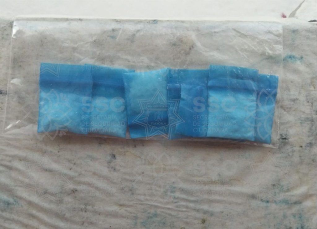 Al inquirir al sujeto, policías estatales le solicitaron realizar una inspección preventiva, localizando entre sus pertenencias siete envoltorios que contenían una sustancia sólida granulada con características propias del narcótico conocido como “cristal”.