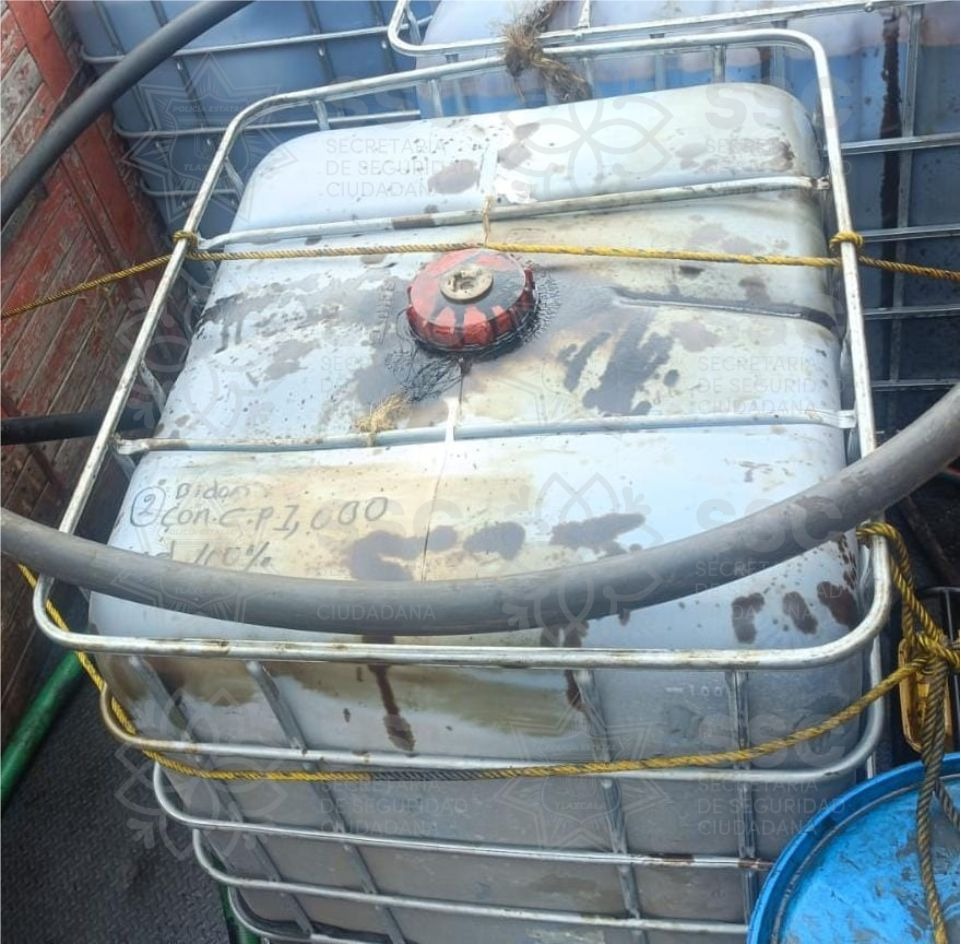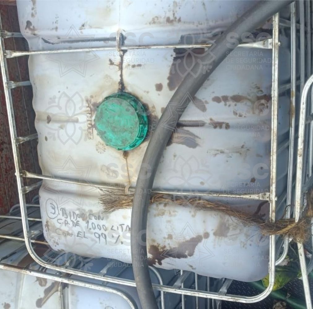 Tras la inspección del vehículo, los elementos de seguridad localizaron tres contenedores con capacidad de mil litros cada uno, al 95% de su capacidad, además de un tambo con capacidad aproximada de 200 litros, al 60% de su capacidad.
