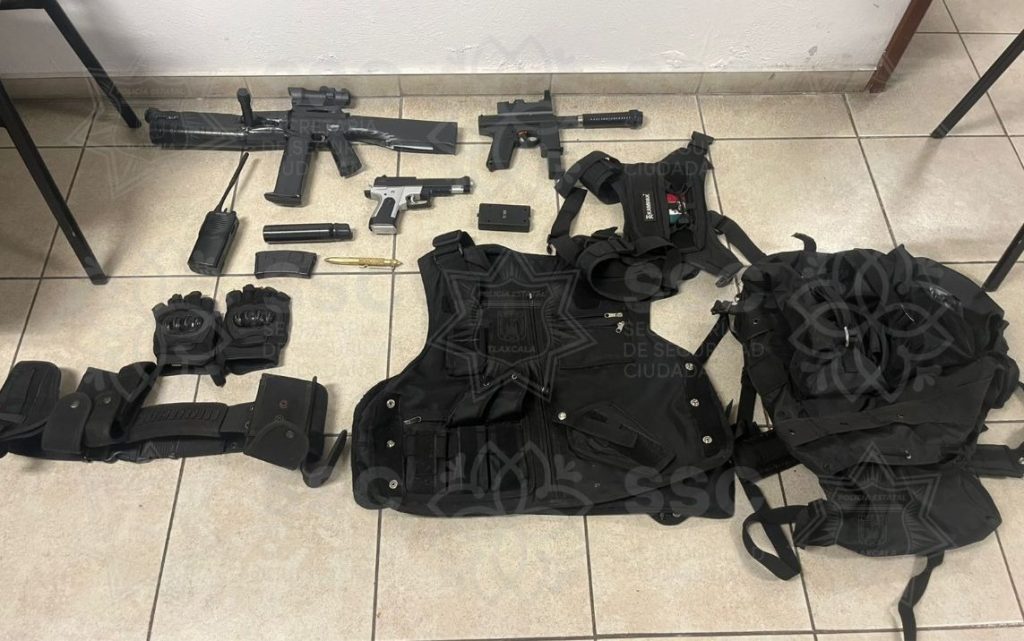 Ante esta situación, los oficiales le realizaron una inspección preventiva conforme a los protocolos establecidos, localizando entre sus pertenencias: una réplica de arma de fuego corta, una réplica de arma larga, una réplica de arma tipo subametralladora, gas pimienta, un radio portátil, un dispositivo tipo táser color negro, una fornitura y un chaleco balístico.