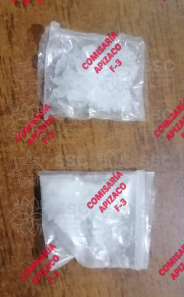Tras efectuar una inspección de seguridad al vehículo y al individuo, quien se identificó como Alexander N., de 22 años de edad, los oficiales localizaron bolsas transparentes de plástico que contenían una sustancia granulada con las características propias de la droga conocida como cristal.
