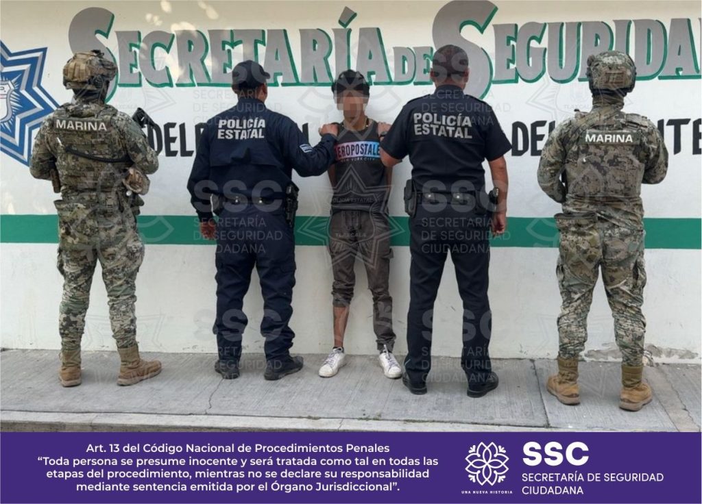 En el marco de los recorridos permanentes de vigilancia y prevención del delito, elementos de la Secretaría de Seguridad Ciudadana (SSC), en coordinación con personal de la Secretaría de Marina (MARINA), realizaron la detención de un sujeto por su probable participación en delitos contra la salud, en el municipio de Papalotla.