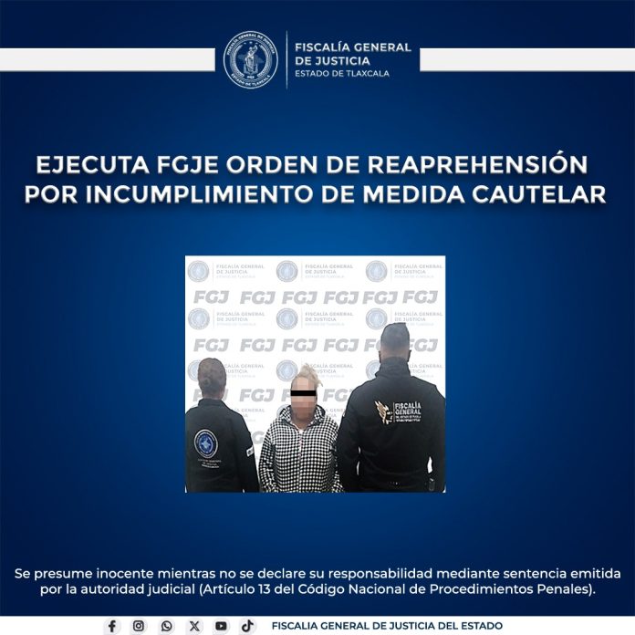 Elementos de la Policía de Investigación de la Fiscalía General de Justicia del Estado (FGJE) ejecutaron una orden de reaprehensión en contra de Magali N., debido a que incumplió la medida cautelar de firma periódica impuesta por un Juez dentro del proceso que enfrenta por el delito de lesiones.