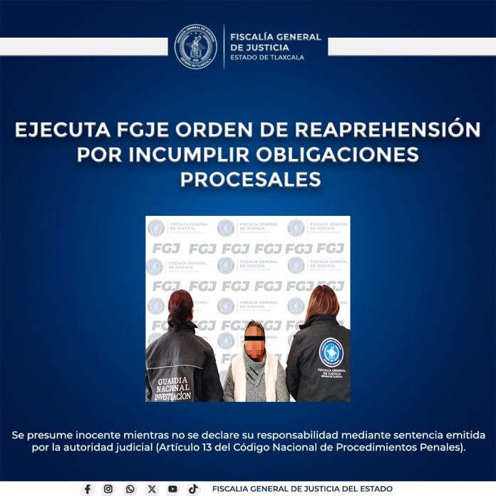 Elementos de la Policía de Investigación de la Fiscalía General de Justicia del Estado (FGJE) ejecutaron una orden de reaprehensión en contra de Agustina N., por incumplir las obligaciones procesales impuestas por un Juez Penal del sistema tradicional, dentro del proceso que enfrenta por el delito de despojo.