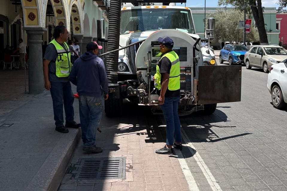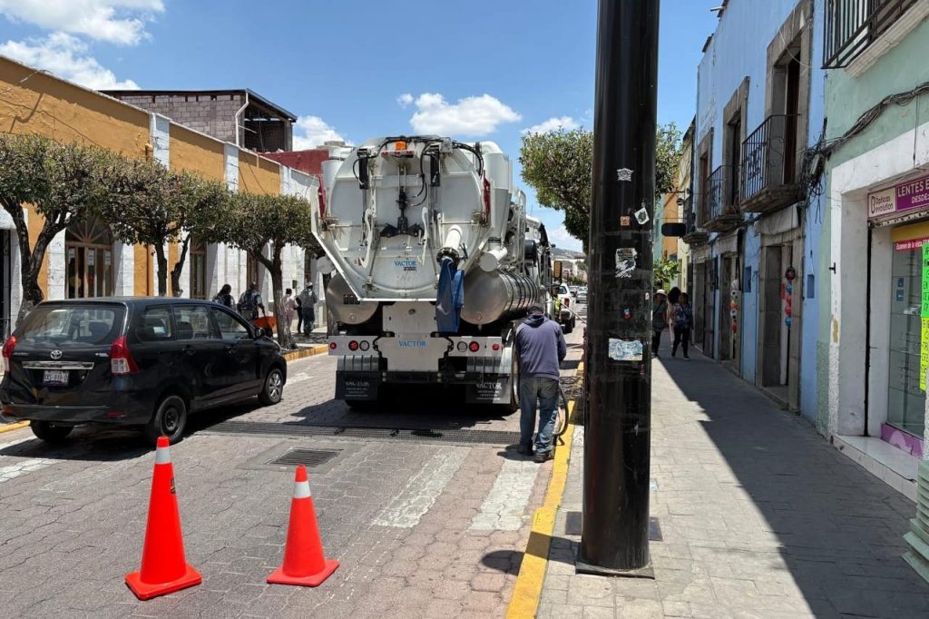Las brigadas limpian rejillas en la zona del mercado “Emilio Sánchez Piedras” y con el apoyo del camión Vactor se desazolvan alcantarillas en la Av. Juárez
