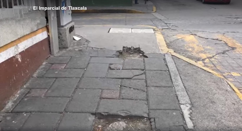 Huamantla, Tlax.- Severos daños lucen las banquetas de algunas calles en el centro histórico de la ciudad de Huamantla. Daños que desde el mes de agosto fueron denunciados por transeúntes y que la Dirección de Obras Públicas no ha reparado.