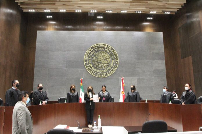 Tlaxcala,Tlax. -En sesión ordinaria de Pleno, la Magistrada Presidenta del Tribunal Superior de Justicia y del Consejo de la Judicatura del Estado (TSJ-CJE), Mary Cruz Cortés Ornelas, tomó protesta a Jessica Piedras Ramos, profesionista que cumplió con los requisitos para el cargo de Juez Municipal.