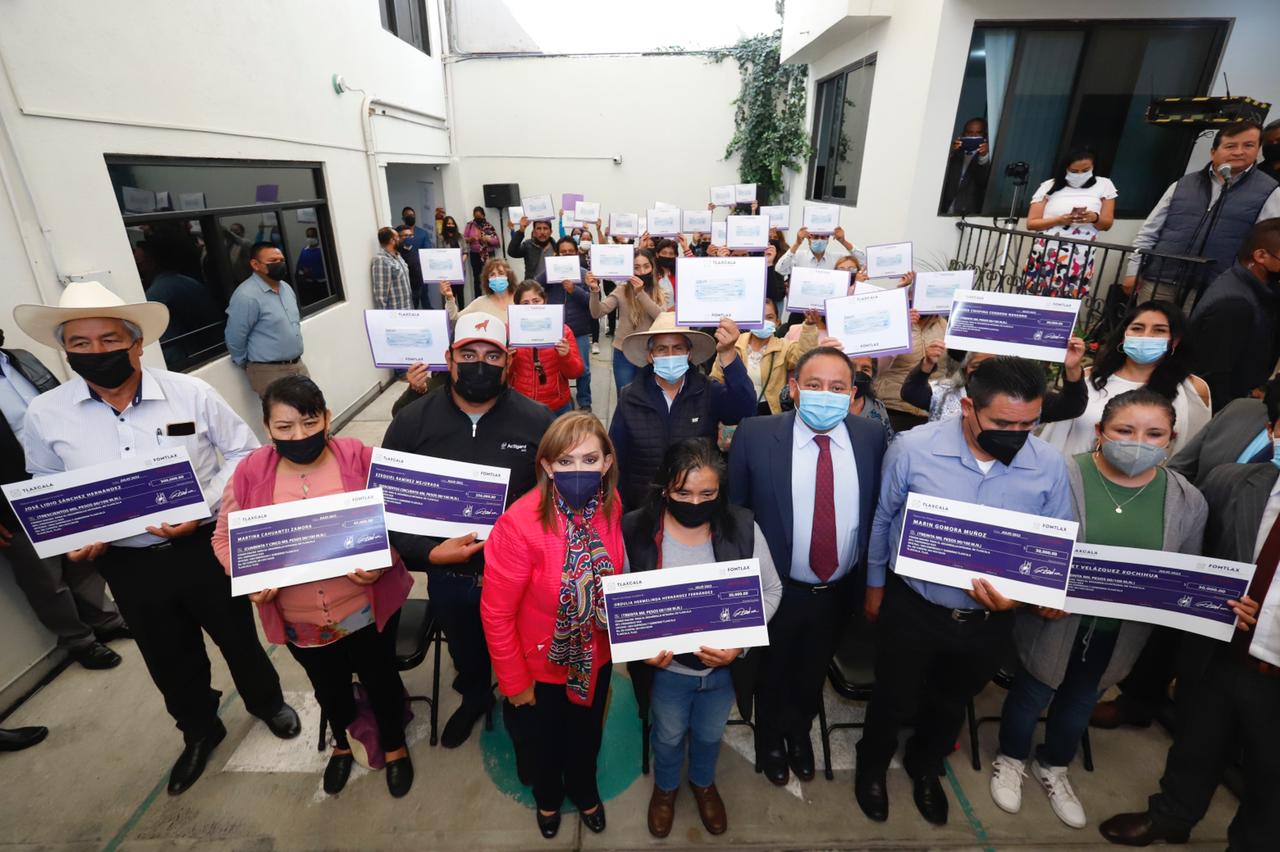 Tlaxcala,Tlax. -La gobernadora Lorena Cuéllar Cisneros entregó simbólicamente cheques por un monto total de 2 millones 159 mil pesos a 59 personas que fueron beneficiadas con un crédito del Fondo Macro para el Desarrollo Integral de Tlaxcala (Fomtlax), a fin de financiar sus proyectos productivos.