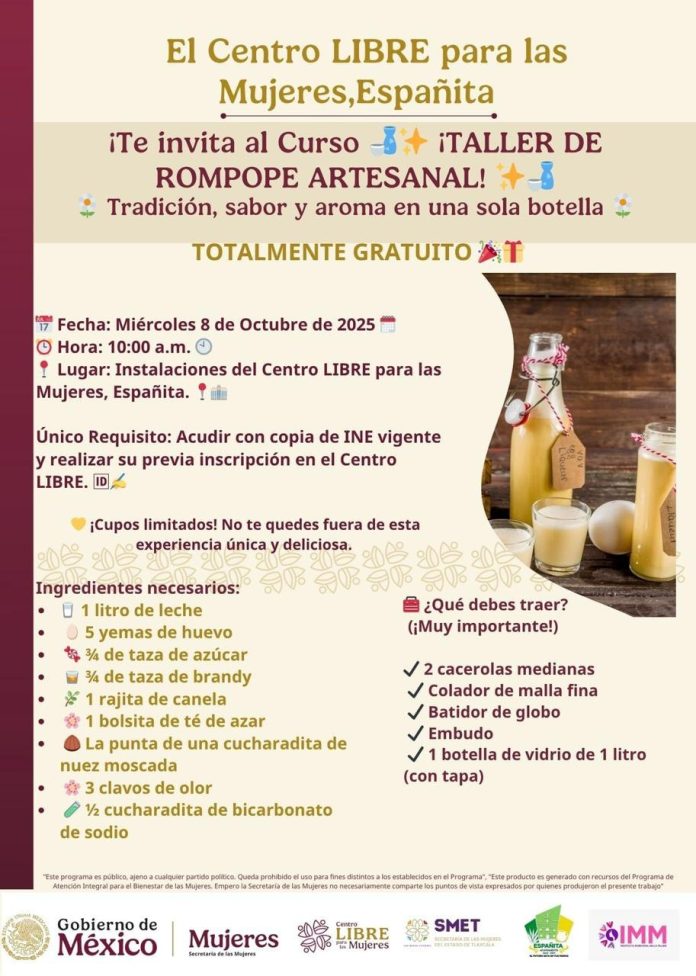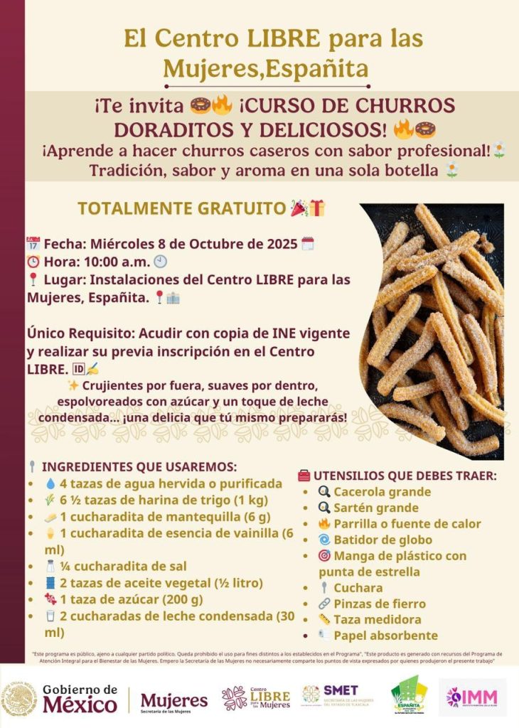Españita, Tlax. – El Centro LIBRE para las Mujeres de Españita continúa impulsando el aprendizaje y el desarrollo comunitario mediante talleres prácticos y llenos de sabor. En esta ocasión, invita a todas las mujeres del municipio a participar en los cursos gratuitos de churros doraditos y rompope artesanal, donde podrán aprender recetas tradicionales con un toque casero y profesional.